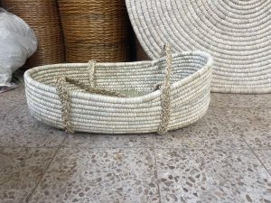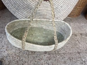 سلة حمل الطفل منسوجة من أوراق نخيل التمر والكرتك (نوع من نباتات السيارات).